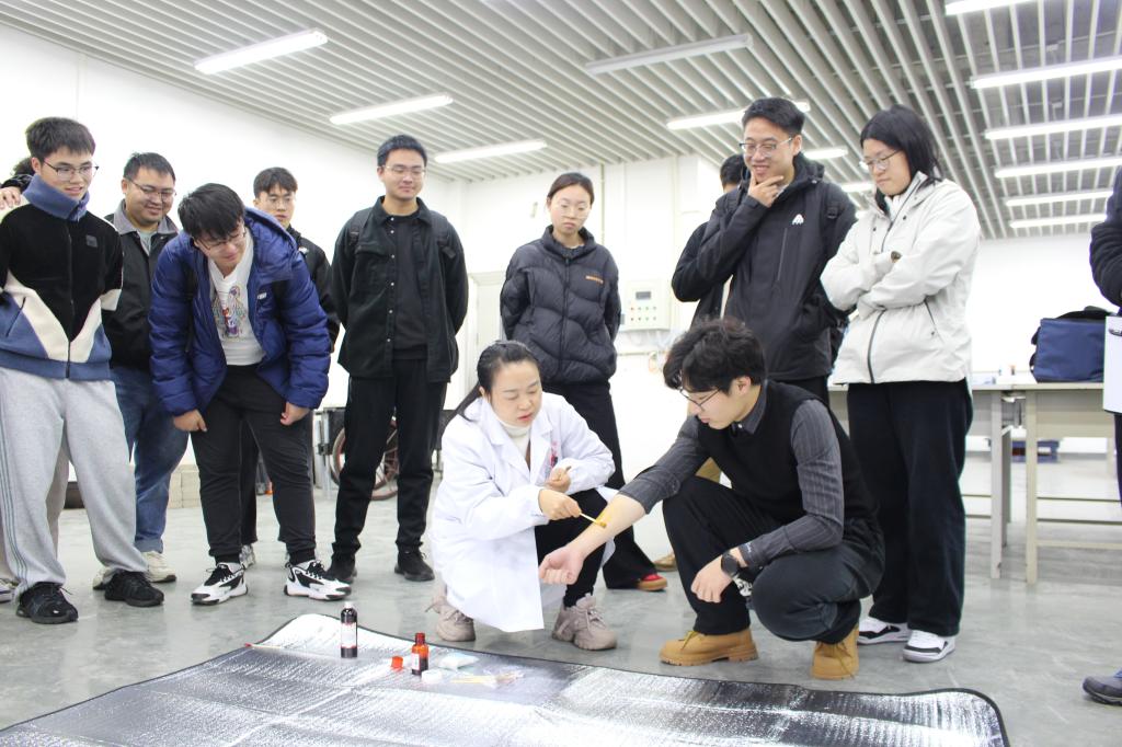 火灾演练模拟电器设备短路引发火情。实验管理人员现场指导灭火器、湿毛巾等灭火工具的正确使用方法,师生迅速响应,完成断电、初期灭火、呼叫消防车及人员疏散等一系列操作。通过实战演练,参训师生掌握了火灾初期处置与逃生自救的关键技能,进一步增强了安全防范意识。