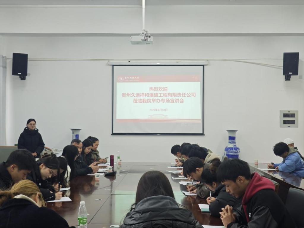 学生工作办公室主任乐筑怡以及贵州久远祥和爆破工程有限责任公司相关负责人出席本次宣讲会。本次招聘会面向我院25届土木工程、工程管理和建筑学专业毕业生。
